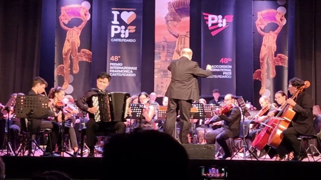The work was commissioned by PIF Castelfidardo 2023 for the third-round final of the Premio competition. It was first performed at Teatro Astro in Castelfidardo, Italy, by Zhiyuan Zhang, Olzhas Nurlanov, and Petar Dinčić with the Orchestra Filarmonica della Calabria, conducted by Alfredo Luigi Cornacchia.
